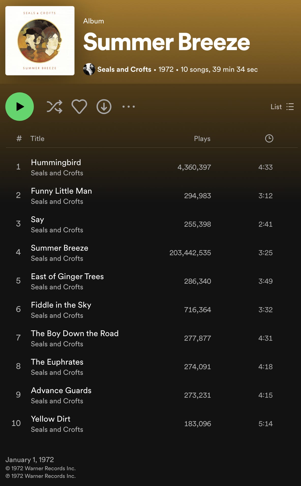 Pictured above is a Spotify playlist of Summer Breeze by Seals and Crofts, a soft rock duo from the 1970s. Spotify is a large music streaming platform. The playlist's tracks mirror the original vinyl format, without each side noted. Each track includes a track length and a play count. It takes at least thirty seconds to count as a play. Tracks appearing…
